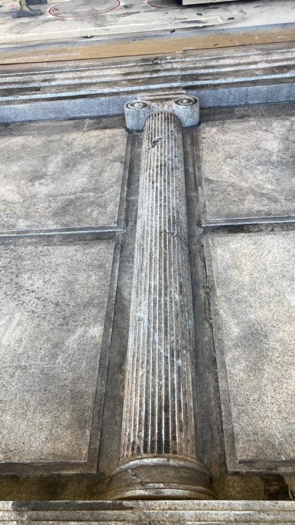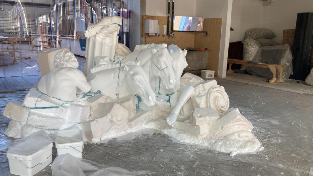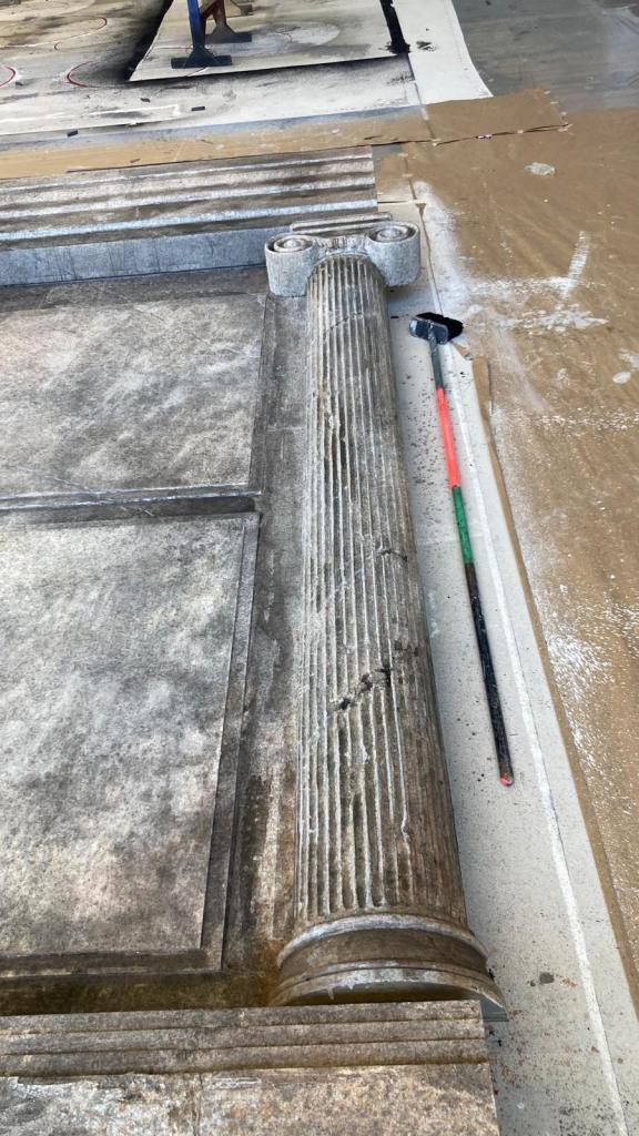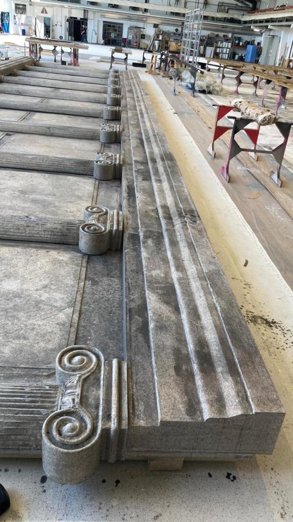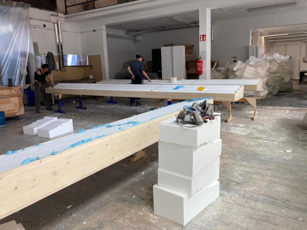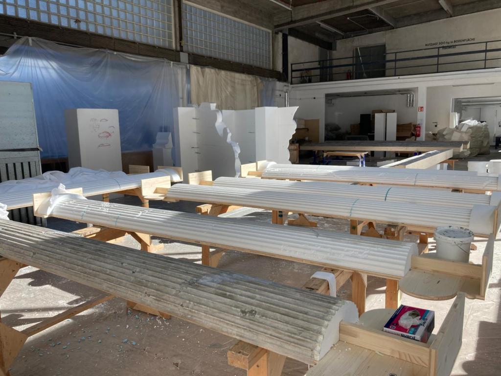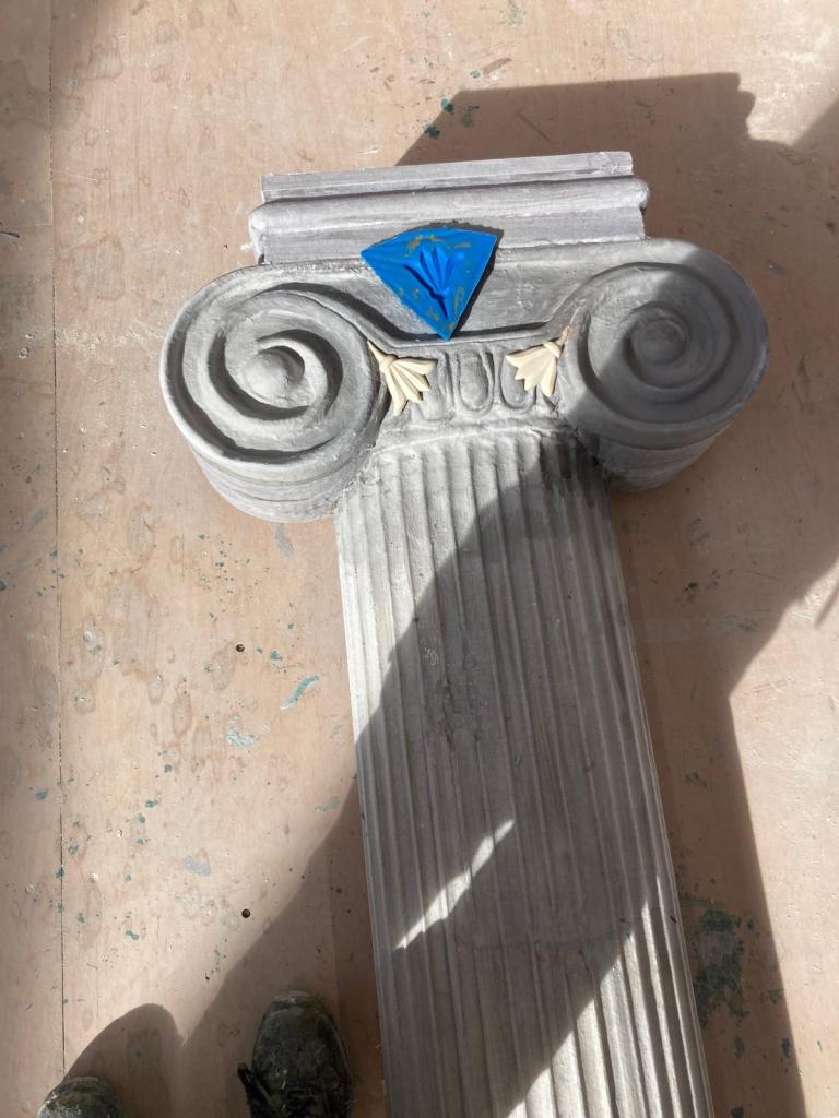Forming the Greek columns: polystyrene (Styrofoam), PU foam, wood