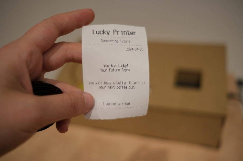 Lucky Printer is an interactive artwork that generates instant comments and predictions on viewers’ future based on fortune-telling, luck and forecasting strategies, with an unlucky twist. The generated fortunes are created in balance (and contrast) to the community background of the intended viewers and are highly seasoned with a mixture of irony, sarcasm, and stereotypical expectations on future – and a little hope.