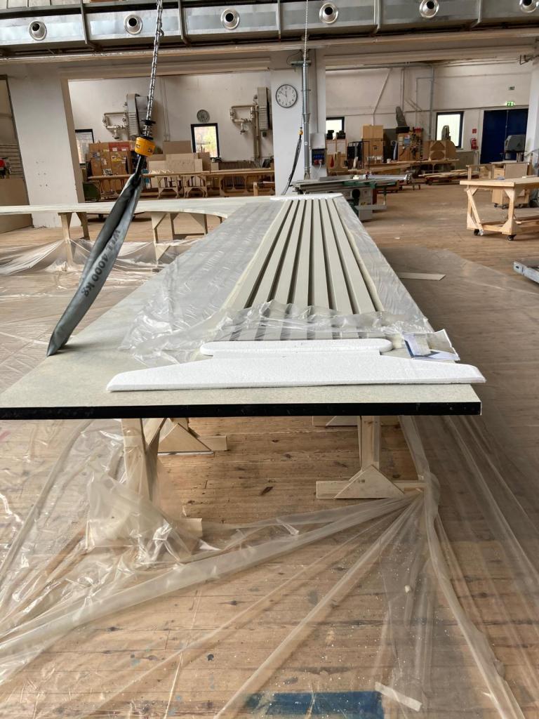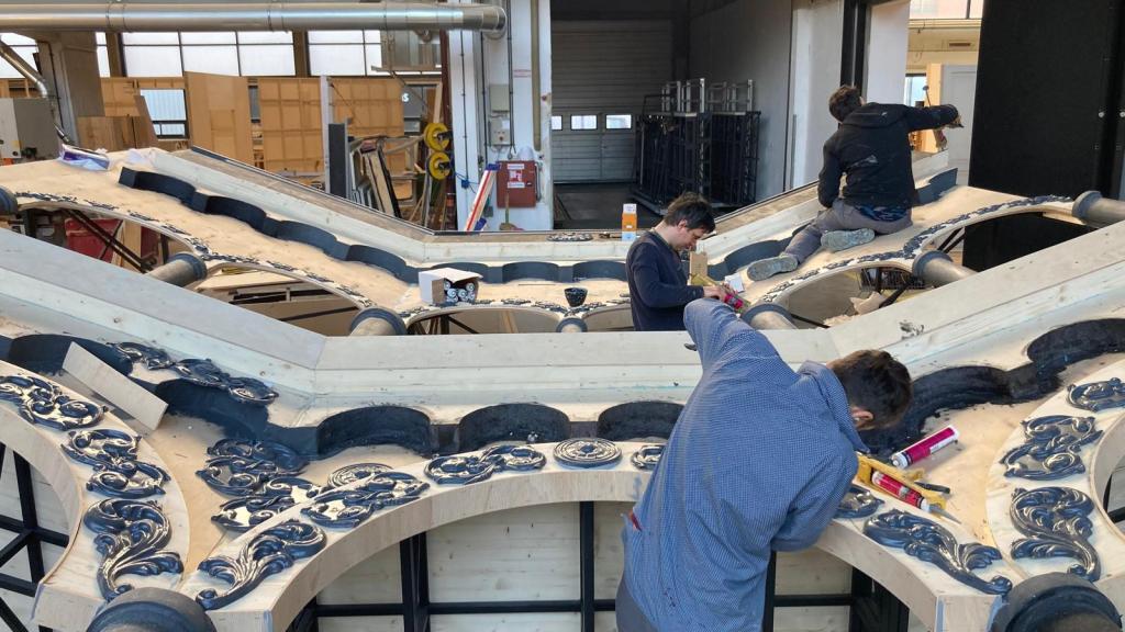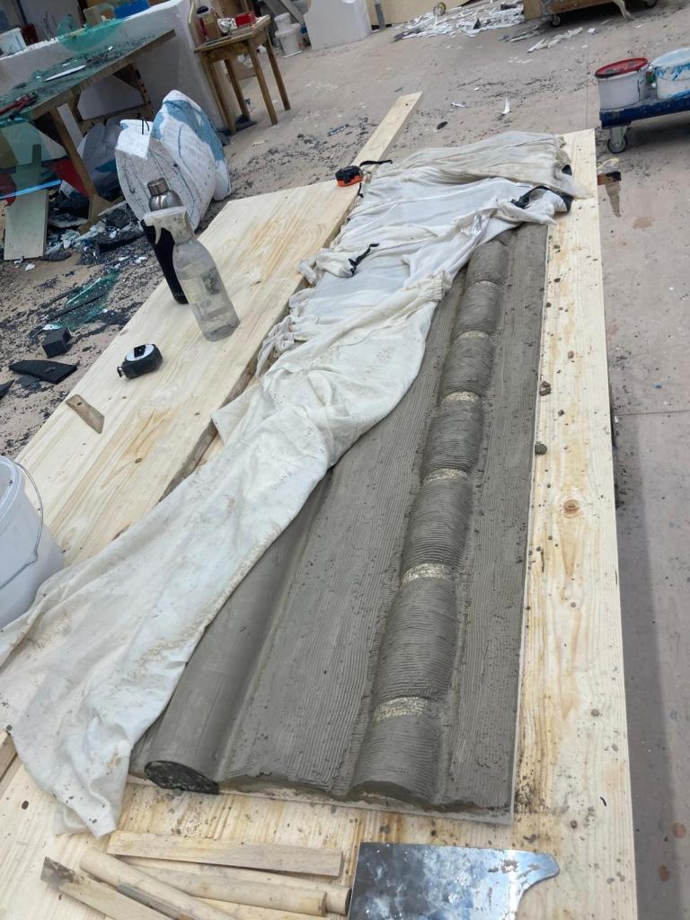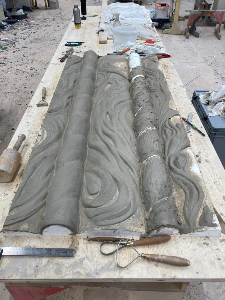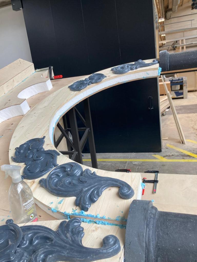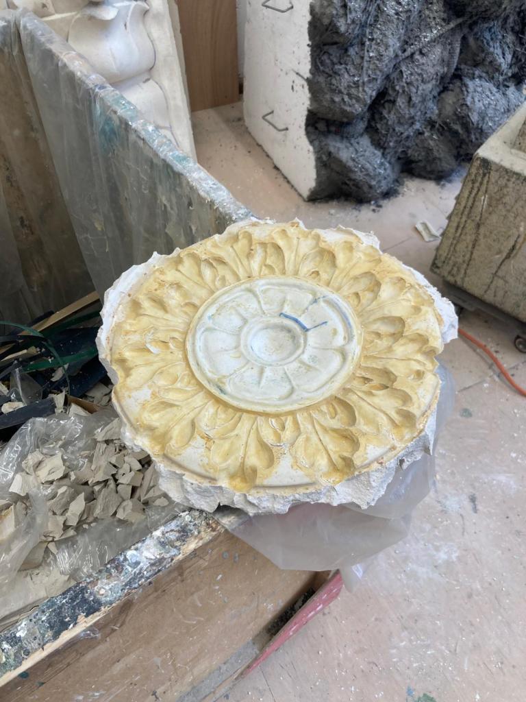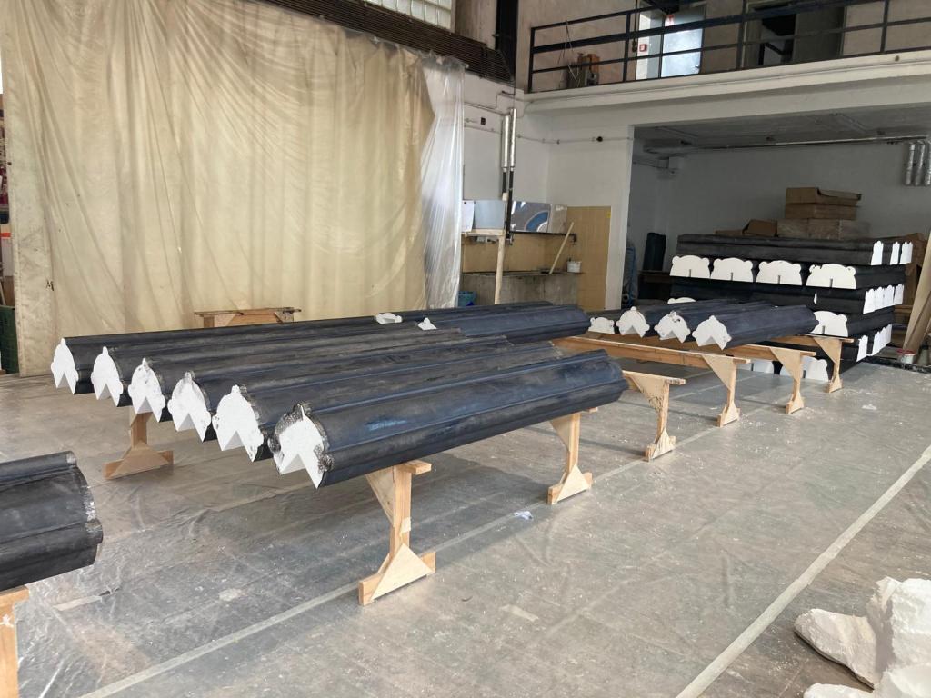 Forming and finalizing the column ornaments: clay, gips (mold), Acrylic one (positive), acrylic hydraulic thermoform, wood, silicone.