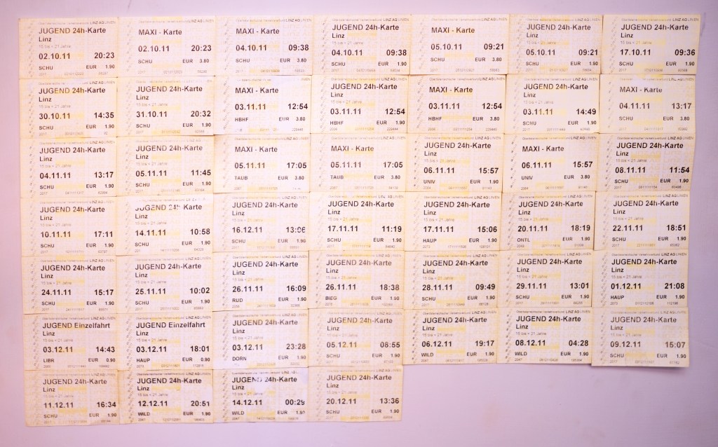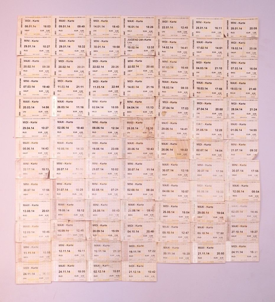 The time period 2011-2019 is exact to the timeline which I have been living, studying and working in Linz, Austria. Tram Series are focusing on daily travel information within this time period, giving detailed date-time-location information, in chronological order. The daily public transportation tickets are presented in division of years. Each month and year has different amount of tickets.
